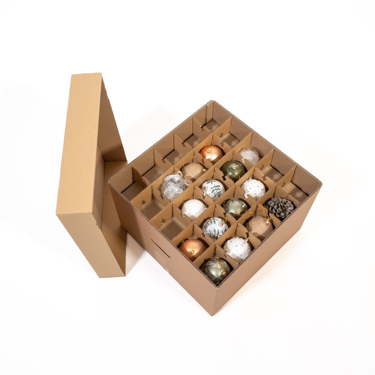 Voici le produit idéal pour organiser et protéger vos décorations de Noël : notre boîte de rangement, spécialement conçue pour stocker jusqu'à 75 boules de Noël. Fabriquée en carton à double cannelure, elle vous assure robustesse et longévité, vous permettant de conserver vos décorations en toute sécurité saison après saison.